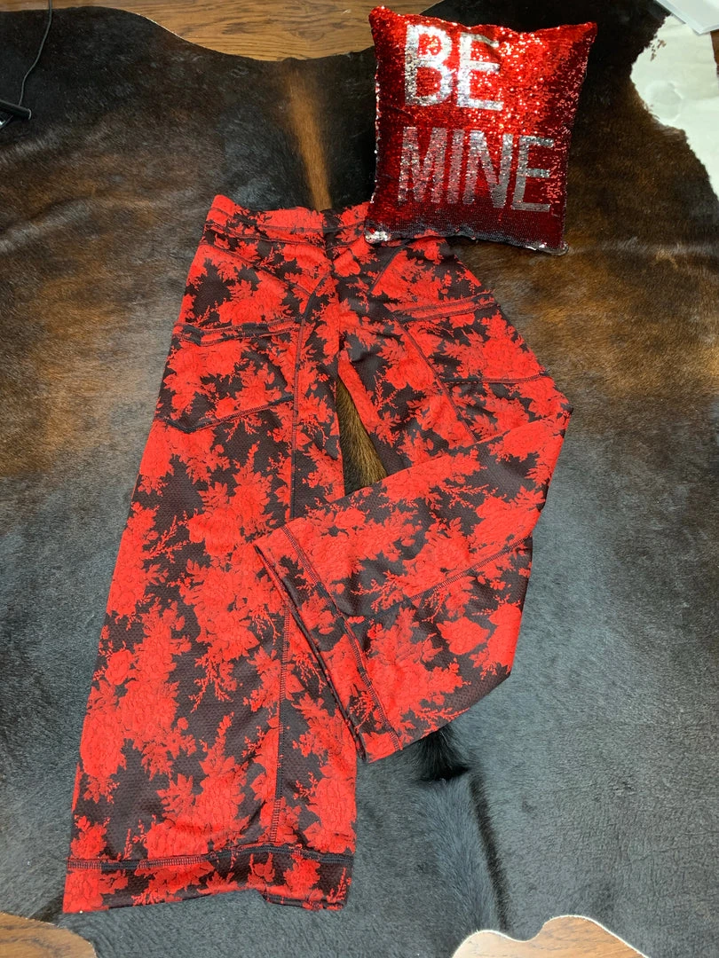 Daphne pant is constructed from a wick away synthetic print, 16 panels serged together then cover stitched in contrasting thread featuring large pockets. ย