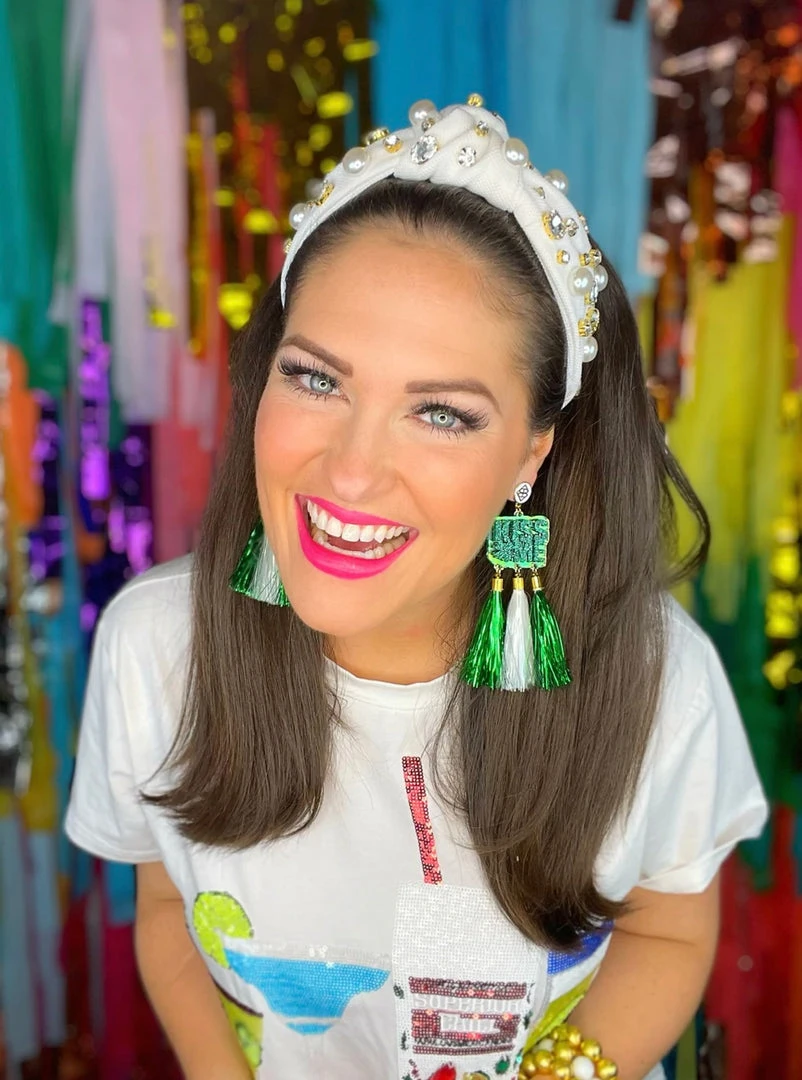 - White twillย headband with large crystals and pearlsย