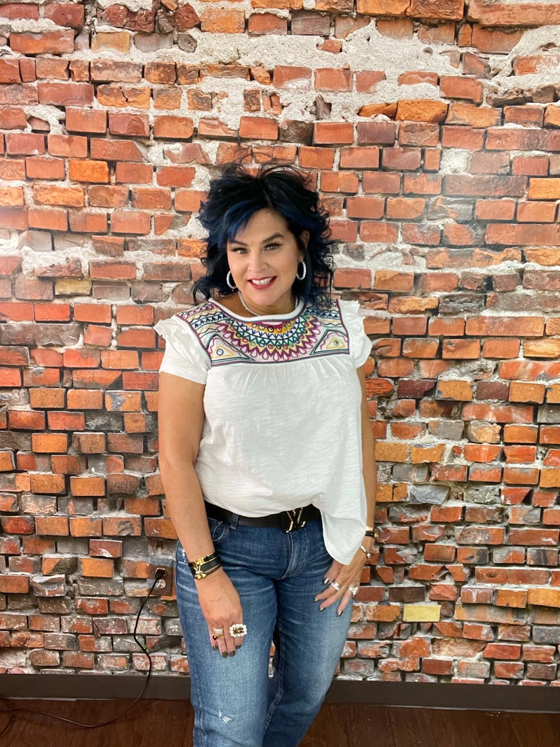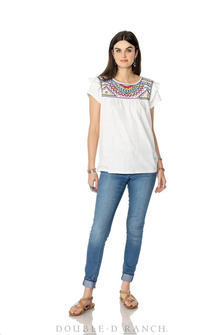 This colorful cutie elevates your everyday outfit with feminine ruffled shoulders and an ornately embroidered yoke with vibes of East India inspiration finished with some subtle sparkle. It’s unique style and flattering fit will have you reaching for this top time and time again.