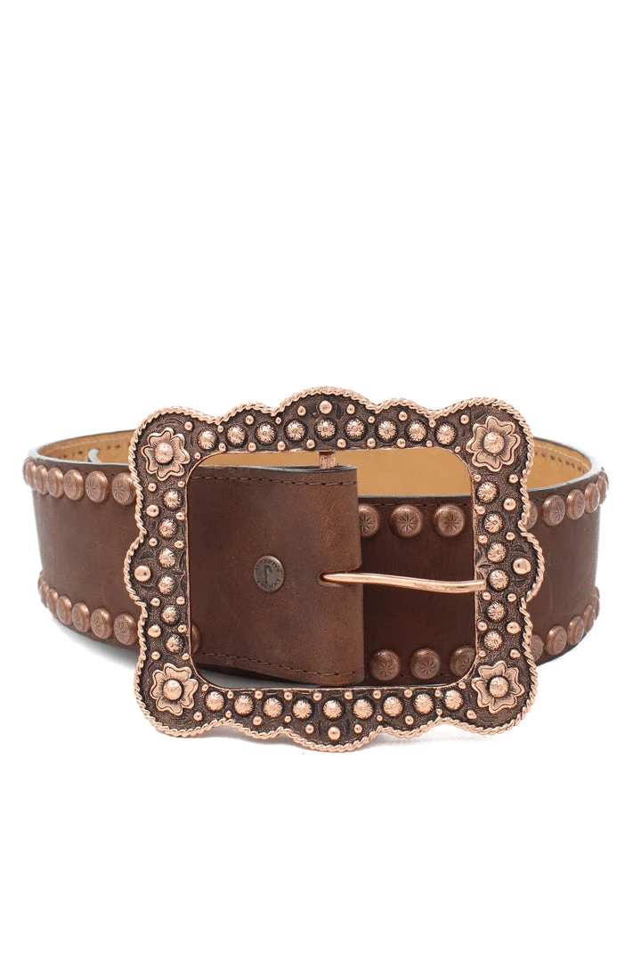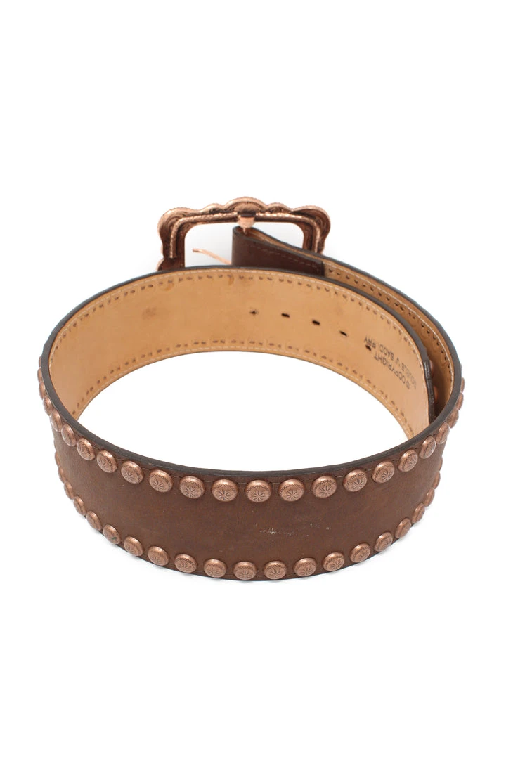 Brown belt with large copper buckle.