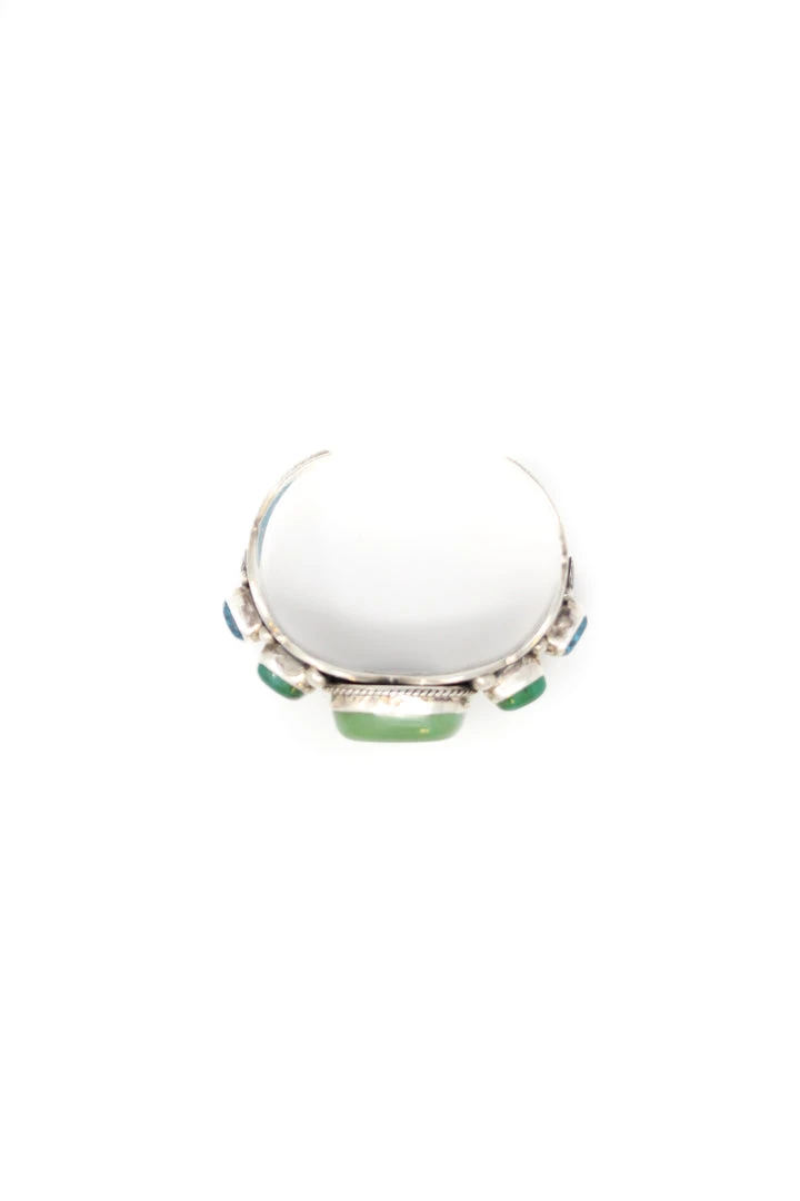 This sterling silver cuff featuresΒ one large green Persian TurquoiseΒ stone, two Jade stones and two Morenci Turquoise stones. Β Designed byΒ Guy Hoskie.