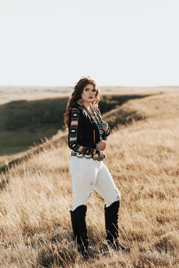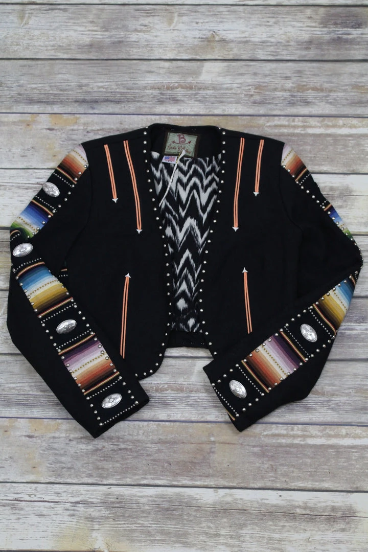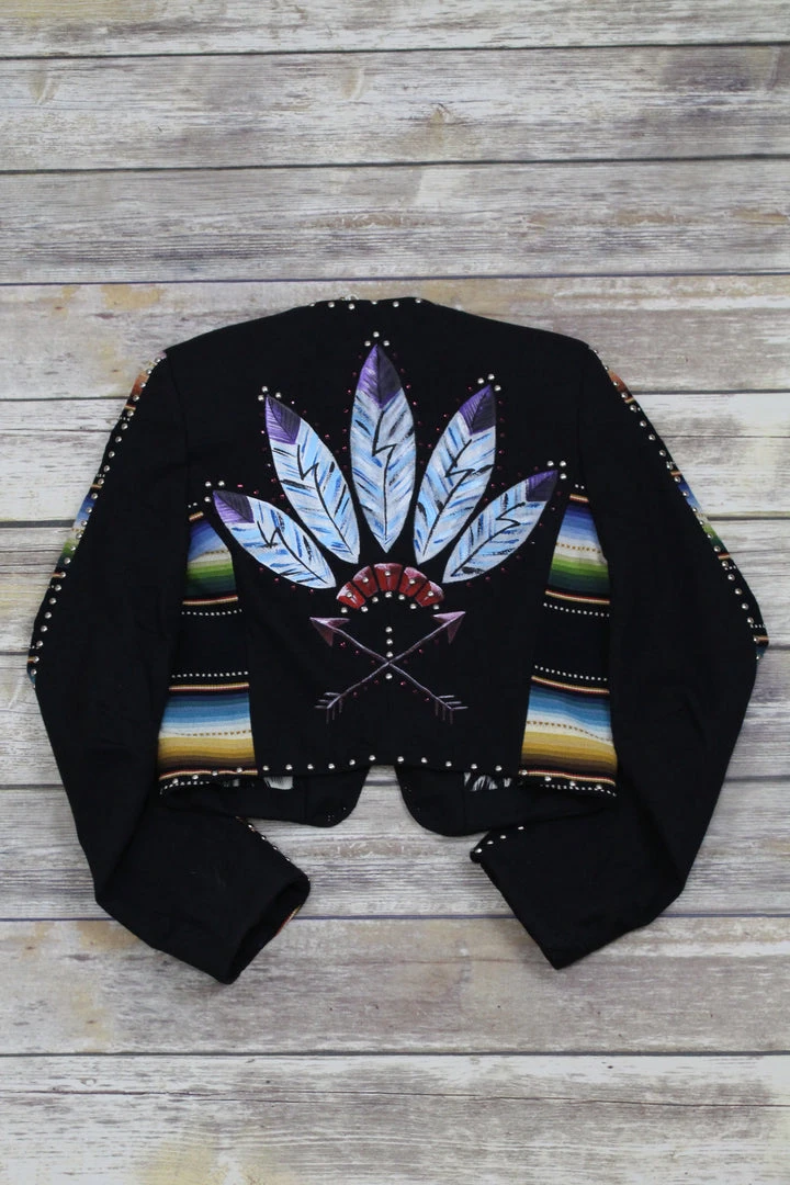 So sleek and elegant – western wear with a touch of vintage moto! This amazing limited edition bolero jacket is made with a midnight black wool blend and woven serape, and features a one of a kind handpainted feather design on the back, accented with silver studs and Swarovski crystals. The front features gorgeous piped welts which accent the fit of the jacket – each is finished off with a hand embroidered arrow tack. Silver studs line the edges and accent the woven serape trim on each sleeve. Silver conchos shine bright on each sleeve as a final crowning touch! Jacket is wool/acrylic blend, serape is 100% woven cotton. Fully lined.