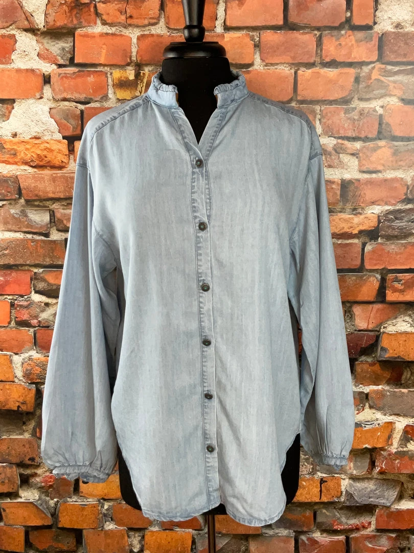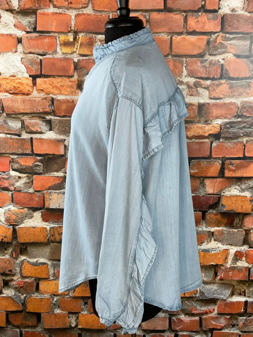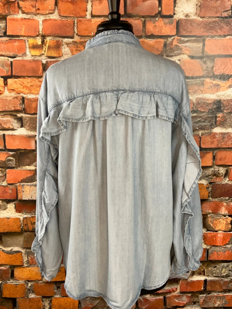 Denim says comfort all the way and the ruffle across the back of the sleeves and back say all girl!