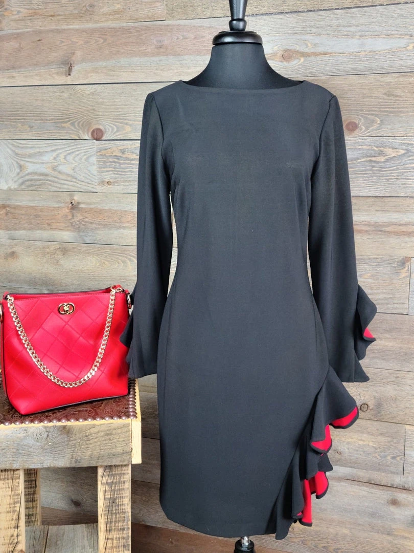 Simple with a flair! Black dress with red lining that is also exposed in the ruffles on the dress and sleeves.