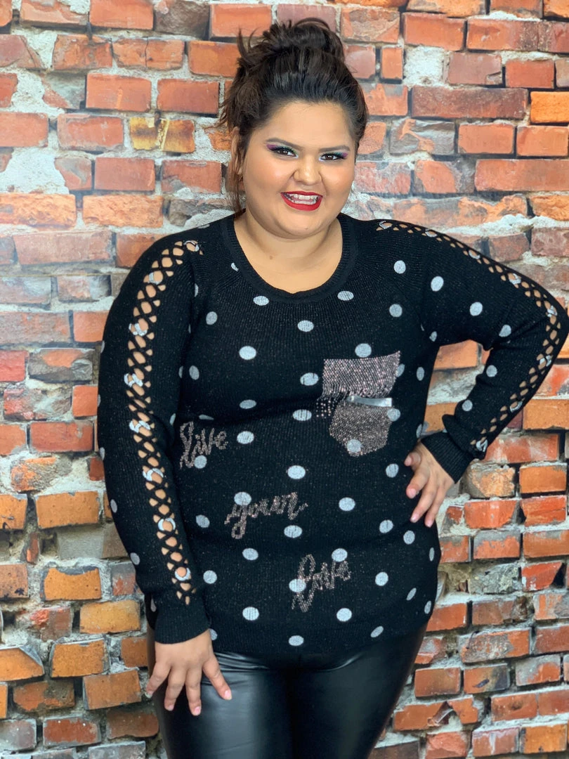 What a fun sweater! ย Love all the sparkles, polka dots, sparkly stones, metallic silver and the peekaboo cutouts all down the sleeve๐ฅฐ๐ฅฐ๐ฅฐ